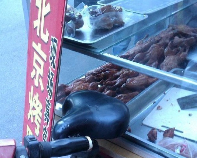4月8日,記者對(duì)北京西站等地的烤鴨市場進(jìn)行了暗訪。北京西站旁的北蜂窩西路上,一個(gè)流動(dòng)攤販的推車前掛著“北京烤鴨25元/只”的牌子。推車的玻璃柜里陳列著20多個(gè)烤好的鴨子,玻璃柜上方還放著已經(jīng)包裝好的“全聚德”和“金聚福”的烤鴨,旁邊還有幾個(gè)全聚德烤鴨的包裝袋。