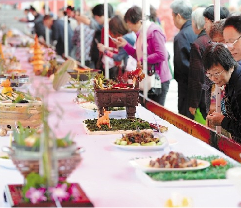 一年一度“中國(guó)?臨安百筍宴美食文化節(jié)”上,臨安市28家主要餐飲企業(yè)為市民獻(xiàn)上一桌桌獨(dú)具匠心的筍宴和百余只筍菜,引來眾多食客圍觀。梁臻、張偉星攝
