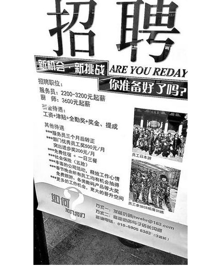 服務(wù)員越來越緊俏,薪水也水漲船高,福利待遇也成為招聘時的砝碼。北青報記者發(fā)現(xiàn),一家大牌連鎖餐飲機構(gòu)貼出的服務(wù)員招聘廣告上寫著:“服務(wù)員起薪2200-3200元,廚師起薪3600元,部門優(yōu)秀員工月度獎勵500元、突出進步獎每月200元,免費吃住還有社保。”最吸引眼球的是列出了該公司有豐富活動,得以令員工釋放工作心情,春節(jié)晚會所有員工均有機會抽到免費旅游、各類數(shù)碼產(chǎn)品等大獎。