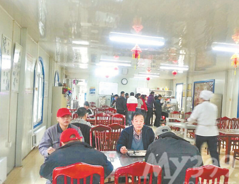 200多平方米的食堂,能容納近百人同時用餐,在墻上的食譜板上寫著“扣肉、小雞燉蘑菇、菜心燒木耳、土豆絲、柿子炒雞蛋、糖醋黃瓜”,免費的綠豆粥已經盛在了保溫桶中。兩葷兩素8元錢,米飯給的量足夠20多歲的小伙子吃。