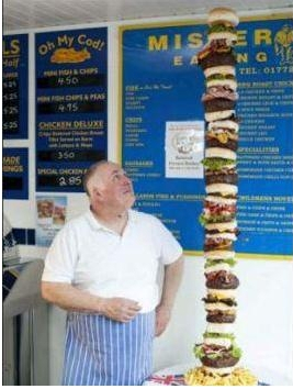 日前,英國蘭開夏郡一家名為“吃貨先生的飲食廣場”(the Mister Eater's Eating Emporium)的快餐店老板約翰?克拉克森(John Clarkson)和夫人花1個半小時聯(lián)手打造了這個約1.62米高,含30000 卡路里的巨型漢堡,并用特制金屬底座將其加固,確保巨型漢堡不會崩塌。