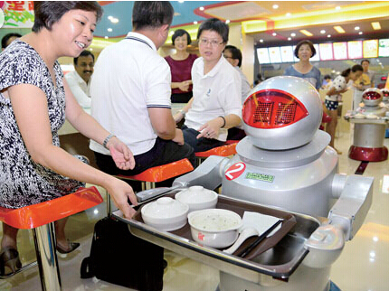全國首家機器人餐廳日前亮相江蘇昆山。走進這家餐廳,“大黃蜂”為您唱歌跳舞,“擎天柱”的兄弟“鐵皮”負責安保,禮儀機器人親切迎賓,科幻片中的奇妙場景變為現實。這些機器人掌握了迎賓、點餐、傳餐、炒菜、烹炸、煮水餃、下面條等本領,還會說40句基本用語,如“你的菜到了,請慢用”等,當你擋住機器人的路時,它則會說“請讓一下,我很忙噠!”