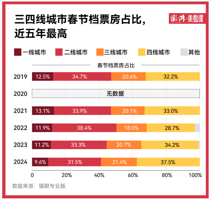 另外,貓眼專業(yè)版數(shù)據(jù)顯示,今年國內(nèi)春節(jié)檔電影市場繼續(xù)下沉。2024年春節(jié)檔三四線城市票房占比達(dá)58.9%,較去年同期提升4個(gè)百分點(diǎn)。